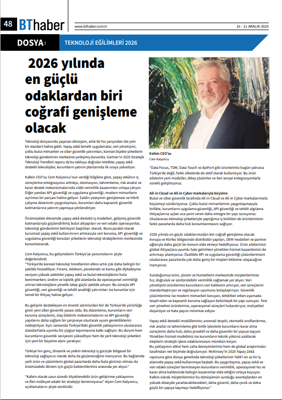 Kafein CEO'su Cem Kalyoncu'nun verdiği bilgilere göre, yapay zekanın iş süreçlerine entegrasyonu arttıkça, otomasyon, tahminleme, risk analizi ve karar destek mekanizmalarında ciddi verimlilik kazanımları ortaya çıkıyor. Diğer yanan API güvenliği ve uygulama güvenliği, modern mimarilerin ayrılmaz bir parçası haline geliyor. Saldırı yüzeyinin genişlemesi ve hibrit çalışma düzeninin yaygınlaşması, kurumları daha kapsamlı güvenlik katmanlarına yatırım yapmaya yönlendiriyor.