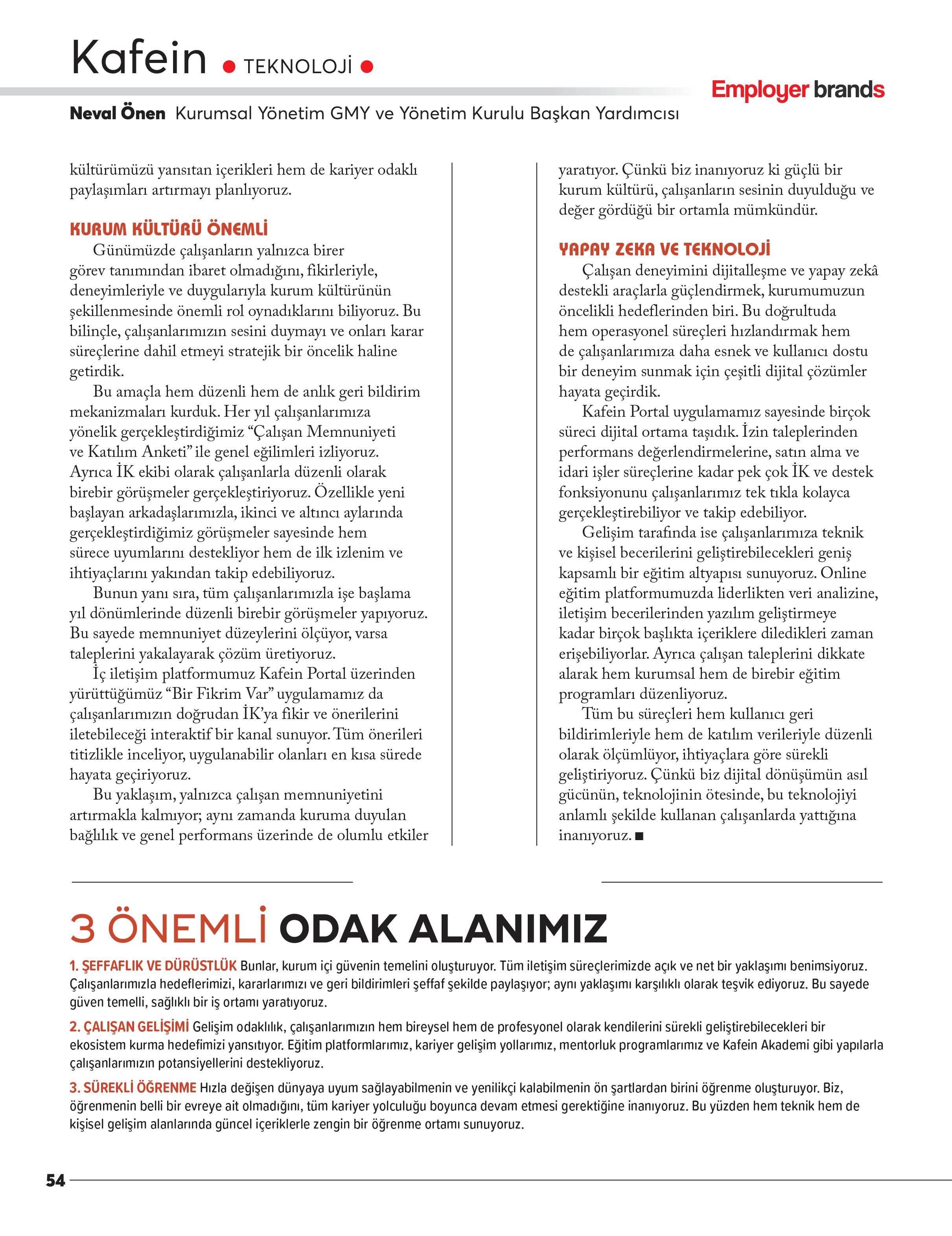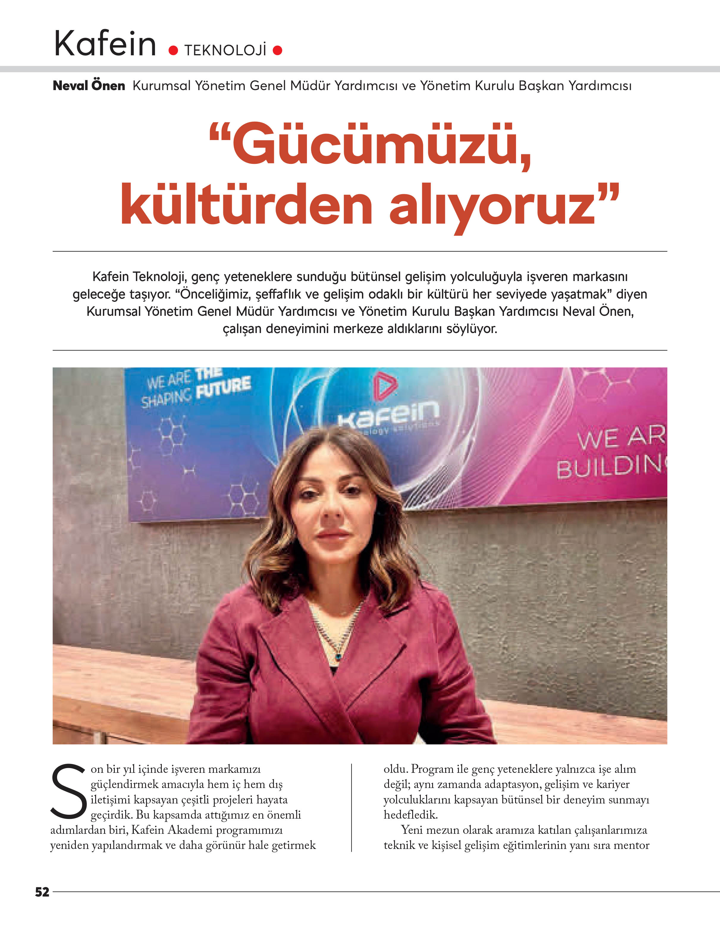 Kafein Teknoloji, genç yeteneklere sunduğu bütünsel gelişim yolculuğunda işveren markasını geleceğe taşıyor. "Önceliğimiz, şeffaflık ve gelişim odaklı bir kültürü her seviyede yaşatmak" diyen Kurumsal Yönetim Genel Müdür Yardımcısı ve Yönetim Kurulu Başkan Yardımcısı Neval Önen, çalışan deneyimini merkeze aldıklarını söylüyor.