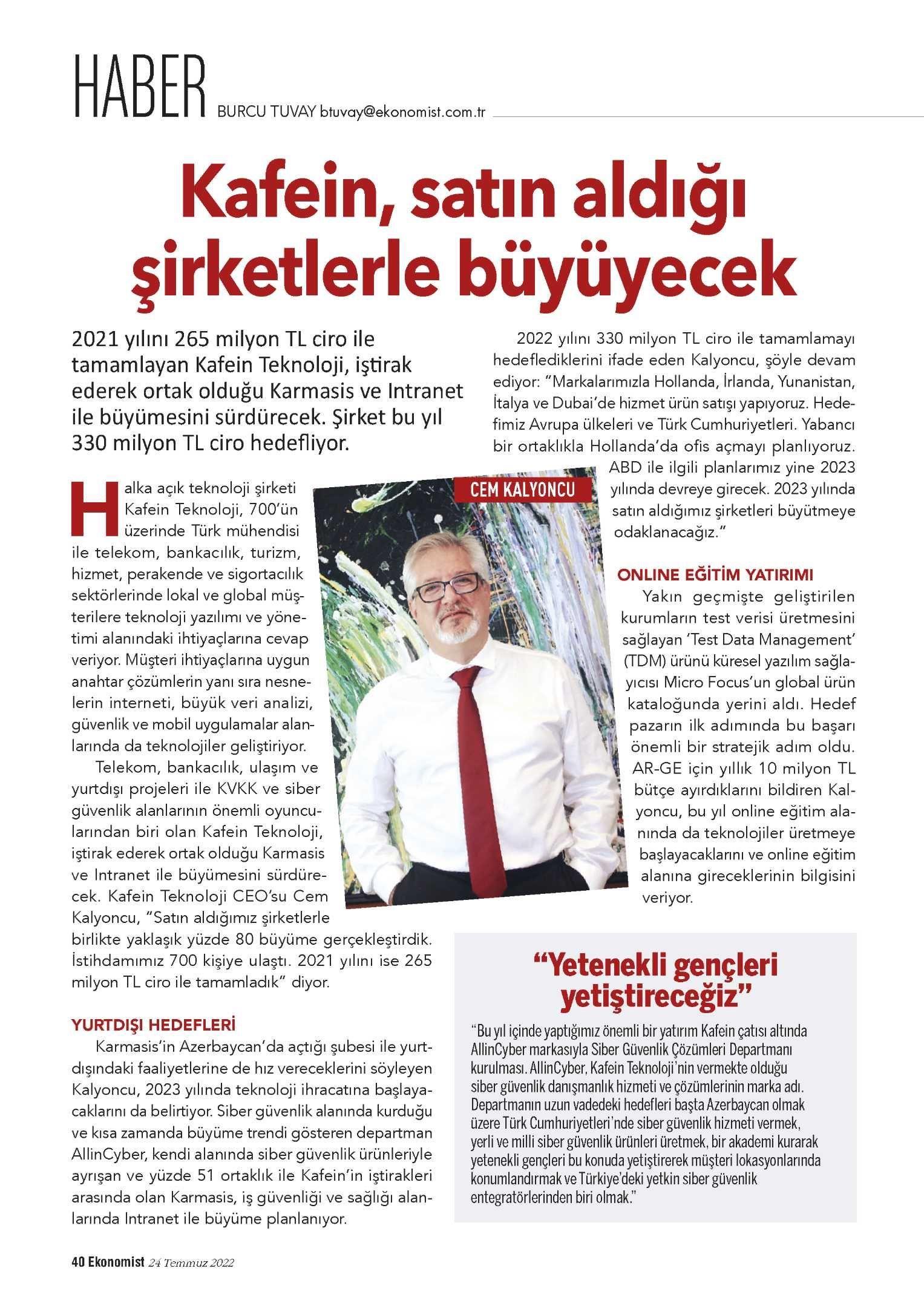 Kafein Technology, one of the important players in the fields of KVKK and cyber security with its telecom, banking, transportation and overseas projects, will continue its growth with Karmasis and Intranet, which it became a partner by participating. Cem Kalyoncu, CEO of Kafein Technology, said, “We realized a growth of approximately 80 percent with the companies we acquired. Our employment reached 700 people. We completed 2021 with a turnover of 265 million.”