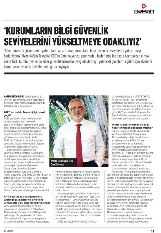 Kafein established the All-in Cyber cybersecurity solutions department, which integrates human, processes, and technology to combat cyberattacks and raise information security levels. The department, which has now grown to 17 people, has gained 18 new business partners and generated 19 million TL in revenue. During this period, the company served more than 30 new clients in various sectors such as banking, finance, automotive, retail, manufacturing, and energy.