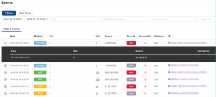 • List and filter all events with details such as method, hit count, risk score, and severity.