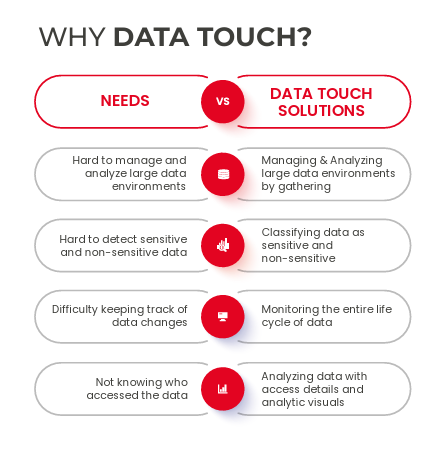 Effectively tracking sensitive data is pivotal for safeguarding personal information and mitigating data misuse cases, particularly within extensive data repositories where sensitive data can be challenging to monitor. To address this challenge, a robust solution is essential for ensuring the meticulous tracking of sensitive data. Introducing Data Touch (DT), a cutting-edge tool seamlessly integrated with database discovery and activity monitoring applications, harnessing the combined insights from both platforms. Data Touch empowers users with a diverse array of analytical capabilities, enhancing their data comprehension and enabling more informed data-driven decisions, all while upholding the paramount principles of data security and privacy. DT is designed to address two core concerns: