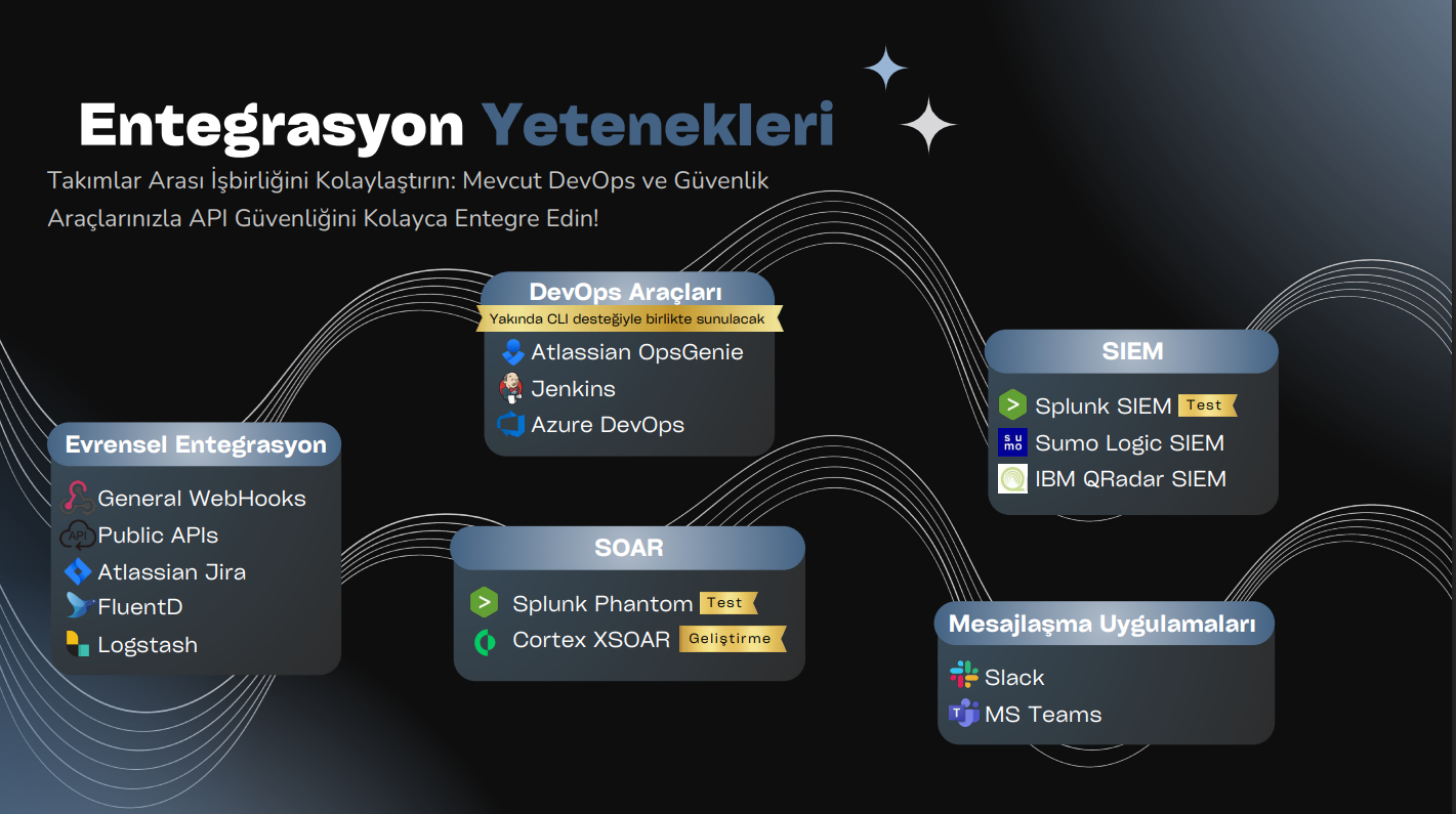 Mevcut DevOps ve güvenlik araçlarıyla API güvenliğini kolayca entegre edin.