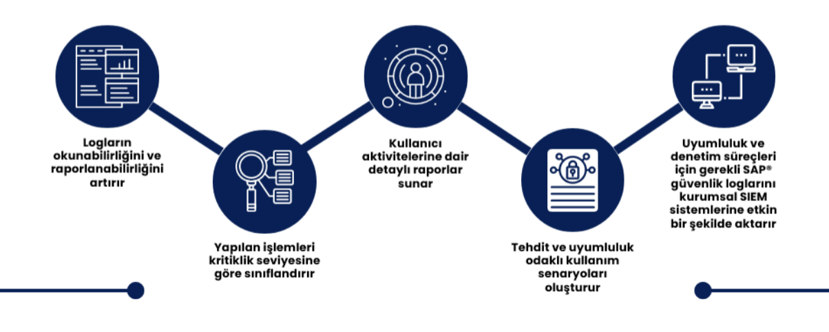 1. Uyumluluk ve Denetim süreçleri için gerekli SAP güvenlik loglarını kurumsal SIEM sistemlerine etkin bir şekilde aktarır.
